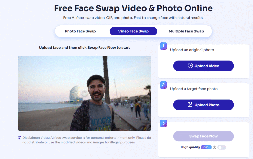 Vidqu AI provides a free online tool that lets you craft a natural-looking AI face swap video: